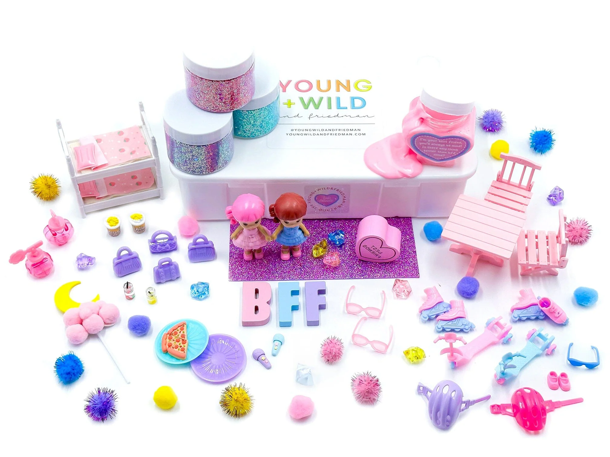 Our BFF Kit is the sweetest friendship-focused kit any kid will want to share with their best friend! With a set of two bunk beds, rollerblades, scooters, helmets, purses, microphones, chairs (and a table!), popcorn, plates, juices, and pizzas, this kit is a nod to "twinning is winning!” when it comes to matching your bestie! Your children will be able to use the dough to create the sweetest best friend scenes - creating meals, sleepover scenes, best friend imprints using the wooden heart stamper and more! It also includes a soft butter BFF slime with the note: "I'm your best friend, you'll always be mine! Is there anything better than BFF slime?" We think your kids might say there isn't! This kit emphasizes the importance of friendship, face-to-face time, and imaginative play! Our accompanying kit curriculum adds to the entire play experience with examples of educational activities you can do alongside your child!